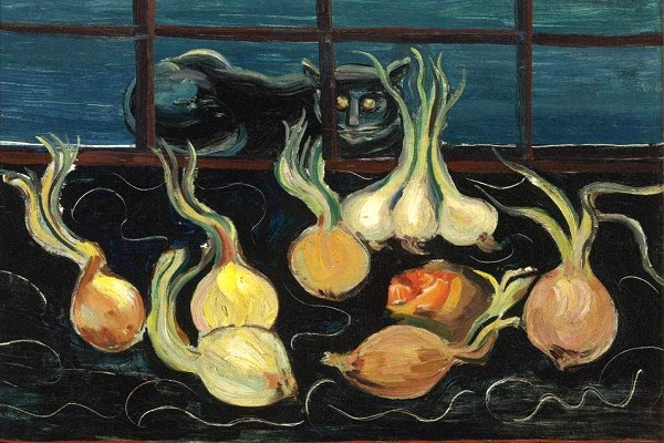 In “Natura morta con gatto e cipolle” (anche se preferisco la versione tradotta dall’inglese, “still life” ovvero “vita ferma”) del 1928, si possono notare chiare tracce dell’espressionismo, e il gatto che osserva la scena dalla finestra sembra essere molto interessato…