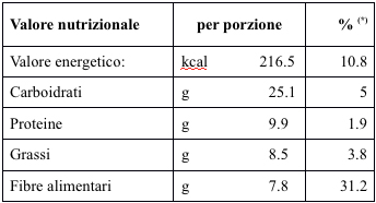 Dove possibile, i dati sono riferiti alle tabelle di Composizione degli Alimenti della��Istituto Nazionale di Ricerca per gli Alimenti e la Nutrizione.(*) % delle quantitA� giornaliere indicative di un adulto, calcolato sulla base di un fabbisogno giornaliero di 2000kcal; il fabbisogno puA? essere diverso a seconda del sesso, della��etA� e della��attivitA� fisica svolta.