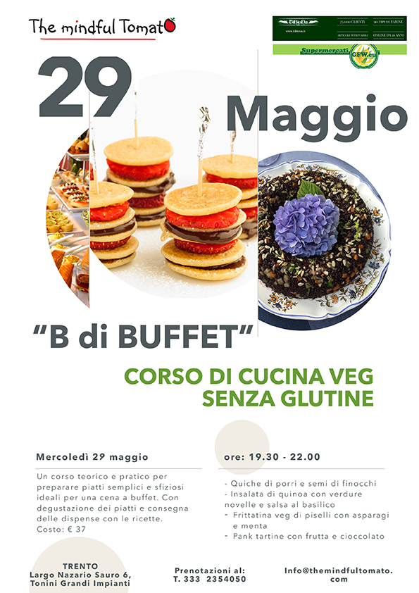 Il prossimo appuntamento con la cucina senza glutine e veg – nonché bio – sarà mercoledì 22 maggio con B COME BUFFET – un corso per imparare a preparare piatti e finger food adatti ad un pranzo o una cena a buffet. Prepareremo: