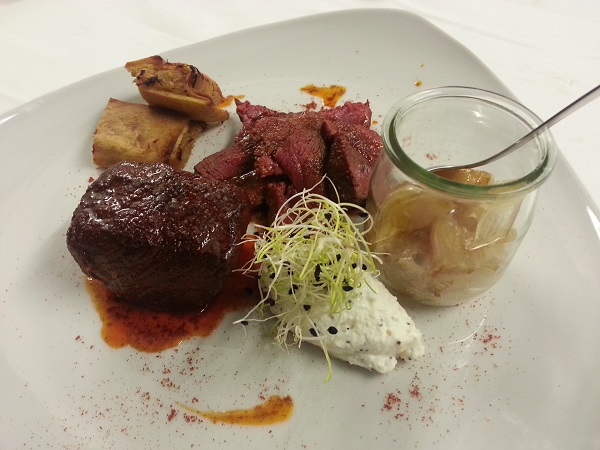 – filetti di cervo alla paprika con mousse di rafano, accompagnati da strudel di crauti e mele e confettura di scalogno;