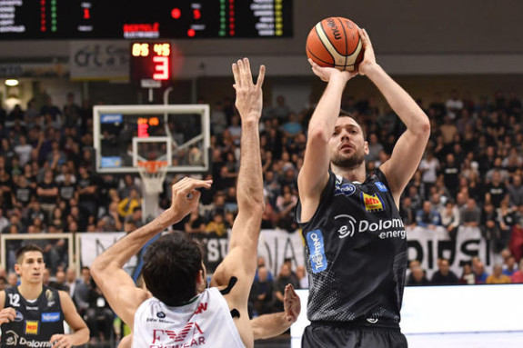 Opposta ad un roster di straordinaria profonditA� come quello di Milano (5 giocatori in doppia cifra), e frenata da una serata agghiacciante al tiro da tre punti (1/16 da oltre l’arco nei primi 28 minuti), una buona Dolomiti Energia deve cedere il passo alla corazzata EA7 con il punteggio di 74-92. A poco, contro le Scarpette Rosse di un micidiale Kruno Simon (19 con il 62% dal campo) e di un decisivo Milan Macvan(12 tutti segnati durante il break chiave), sono servite le prove sopra le righe di Dustin Hogue (17 punti, 9 rimbalzi e 12 falli subiti) e Filippo Baldi Rossi (17 punti con 3/4 dall’arco e 9 rimbalzi).