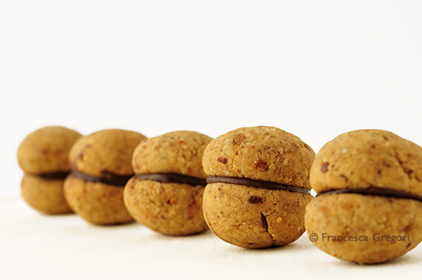 Trito i semi di lino e li metto in una tazzina insieme all’acqua per 20 minuti circa fino a quando avranno assorbito il liquido. Trito anche le nocciole/mandorle finemente con un cucchiaino di farina e le aggiungo al resto degli ingredienti secchi. Mescolo. Unisco anche gli altri ingredienti e impasto con le mani. Formo una palla che mettoA�in frigo per qualche ora. Trascorso questo tempo, preriscaldo il forno a 160A�- 170A�,A�lavoroA�velocemente l’impasto e con esso formo delle pallineA�di circa 1,5 cm di diametroA�che appoggio su una teglia rivestita di carta forno. Inforno per circa 15 minuti. I biscotti non devono scurire o diventare duri (si induriranno raffreddandosi). Una volta raffreddati, sciolgo del cioccolato fondente A�a bagnomaria, lo lascio intiepidire, ne verso un poco al centro di una metA� di biscotto e “cemento” l’altra metA�. Lascio raffreddare. Questi biscotti si conservano per diversi giorni non coperti.