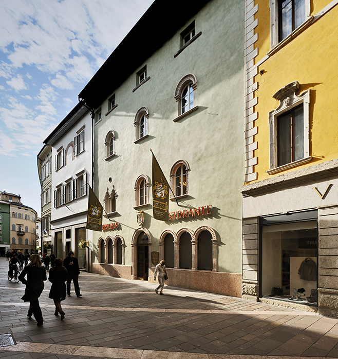 LoA�splendido palazzo che ospita la birreria Forst di Trento si trova nel cuore della cittA�, in via Oss Mazzurana, nel quartiere chiamato nei secoli S. Benedetto, dalla Chiesetta che lo ha caratterizzato fino al 1900, anno in cui fu demolita. Questo angolo di cittA� ha subA�to molte rivisitazioni, sia in epoca pre-conciliare, nella��ambito del restauro della��ornato pubblico voluto dal principe vescovo Bernardo Clesio, sia piA? tardi nel a�?700 e a�?800, fino ad arrivare alla demolizione causata dai bombardamenti durante la seconda guerra mondiale.