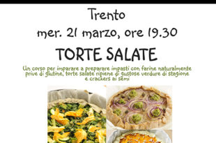 LE TORTE SALATE – CORSO DI CUCINA VEG E SENZA GLUTINE – 21 MARZO, TRENTO Finalmente ritorna anche a Trento il corso di cucina veg e senza glutine LE TORTE SALATE. InsegnerA?A�a preparare impasti con farine naturalmente prive di glutine, torte salate ripiene di gustose verdure di stagione e crackers …