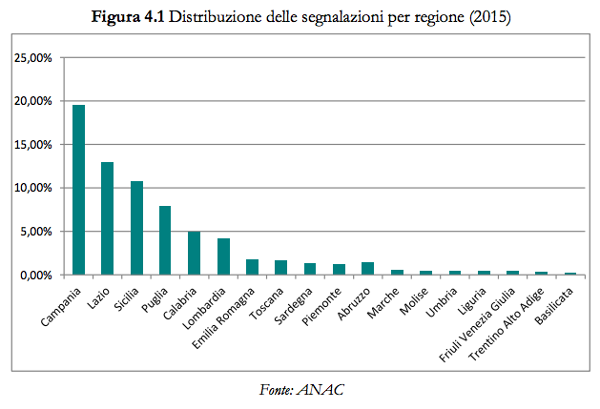 Nel complesso, nel corso del 2015 la��Anac ha avviato 929 procedimenti sulla base di segnalazioni riguardanti corruzione e mancata trasparenza. Le regioni sulle quali si A? concentrato il maggior numero di segnalazioni sono nella��ordine: Campania (19,5%), Lazio (12,9%), Sicilia (10,8%) e Puglia (7,9%). Il Trentino Alto Adige A? la penultima regione in Italia per numero di segnalazioni, prima della Basilicata. Nel 2014, invece attraverso la piattaforma a�?Campagna trasparenzaa�? erano pervenute 757 segnalazioni, la maggior parte in Campania (15,8%), nel Lazio (13,9%), in Sicilia (13,1%), in Puglia (10%) e Lombardia (8,9%). Nei dati relativi al Lazio sono considerate anche le segnalazioni riguardanti gli enti e le amministrazioni di rilievo nazionale, pari alla��8,3% del totale. Il Trentino Alto Adige A? ultima regione per percentuale di segnalazioni: lo 0,3% del totale italiano.