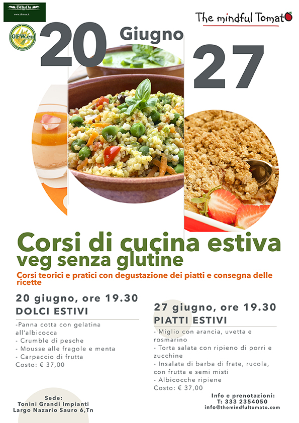 Prepareremo i piatti indicati nella locandina:panna cotta con gelatina all’albicocca, crumble di pesche, Mousse alle fragole e menta, miglio con uvetta, arance e rosmarino, torta salata con zucchine e porri, …
