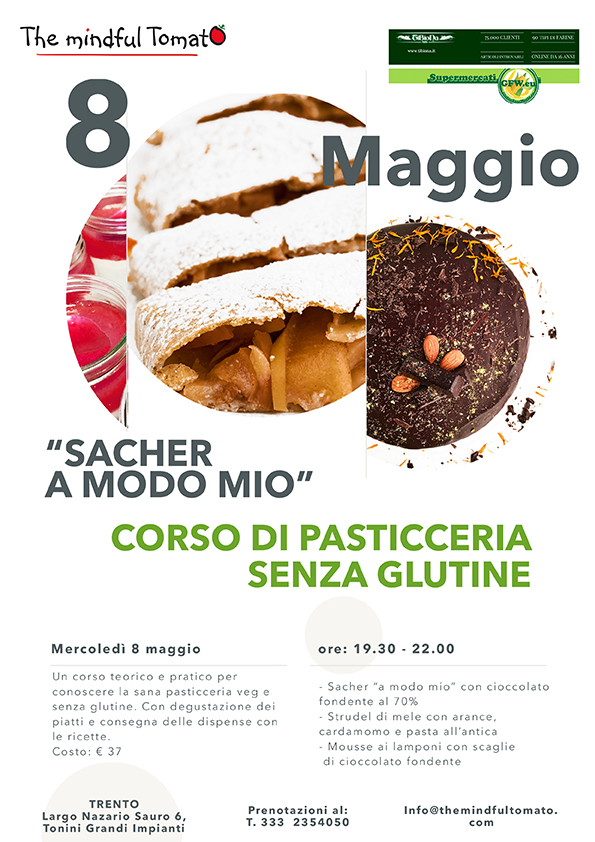 Il prossimo appuntamento con la cucina senza glutine e veg – nonché bio – sarà mercoledì 8 maggio con SACHER A MODO MIO – un corso di pasticceria con ricette sfiziose, allegre ed inedite. Prepareremo: