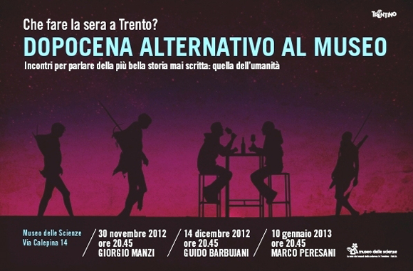 Ultimo appuntamento, giovedA� 10 gennaio alle 20.45 al Museo delle Scienze a�� Aula magna, con il ciclo DOPOCENA ALTERNATIVO AL MUSEO, gli speciali incontri con il ricercatore organizzati dal Museo delle Scienze nella��ambito della mostra Homo sapiens. La��appuntamento vedrA� protagonista Marco Peresani, docente della��UniversitA� di Ferrara, che accompagnerA� i presenti in un viaggio nella storia del primo popolamento delle Alpi orientali italiane.