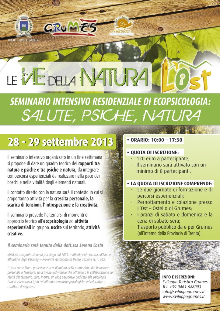 Il seminario intensivo organizzato in un fine settimana si propone di dare un quadro teorico dei rapporti tra natura e psiche e tra psiche e natura, da integrare con percorsi esperienziali da realizzare nella pace dei boschi e nella vitalitA� degli elementi naturali.