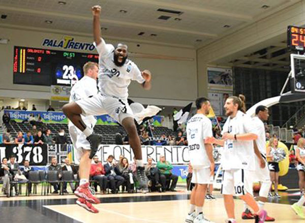 A�Il terzo periodo si apre con Nanterre che scende di intensitA� difensiva e la Dolomiti Energia lesta ad approfittarne con Forray, Sutton e Wright in grande spolvero (45-36). Donnadieu, che in attacco trova punti solo da Riley, deve spendere subito un time-out per ricompattare i suoi e Invernizzi, con due bombe in situazione di gioco rotto, ripaga il coach transalpino tenendo i suoi in scia ai trentini (49-44). Lockett perA? ha troppa voglia di vincere per permettere alla JSF di rientrare, e con tre giocate difensive da manuale e tanta aggressivitA� sotto il ferro avversario dilata il margine aquilotto fino alla doppia cifra (54-44). Una fiammata di Gerald Robinson da una parte e la pronta risposta di Wright col gioco da tre punti dall’altra fissano il punteggio sul 59-50 al 30′.A�
