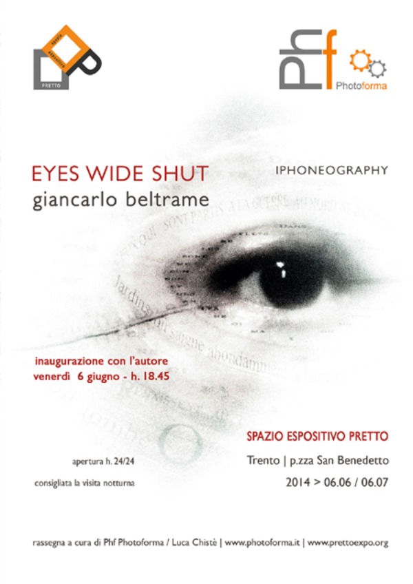 La rassegna, il cui titolo A? basato sul celebre film di S. Kubrick (“Eyes wide shut” A? un ossimoro, diversamente – e difficilmente – traducibile dall’inglese come: “Occhi spalancati chiusi” o “Occhi apertamente chiusi”), rappresenta un interessante percorso visivo di Giancarlo Beltrame, straordinario conoscitore del cinema e appassionato fotografo-ricercatore di Iphoneography.