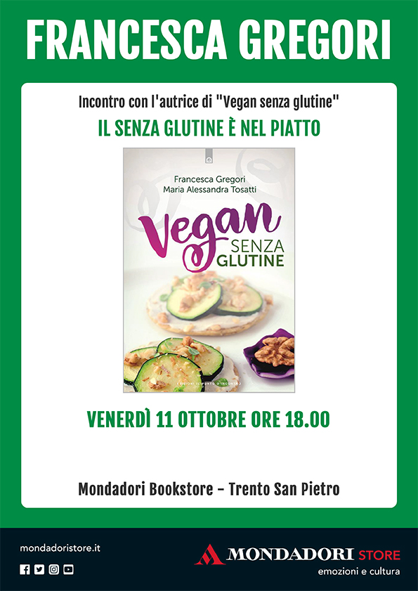 Venerdì 11 ottobre alle ore 18,00 presso la libreria Mondadori di Via San Pietro a Trento, terrò il primo di 3 incontri dedicati alla cucina veg e senza glutine. Gli incontri avranno la durata di circa un’ora e si svolgeranno in forma di chiacchierata con spazio per le domande e curiosità.