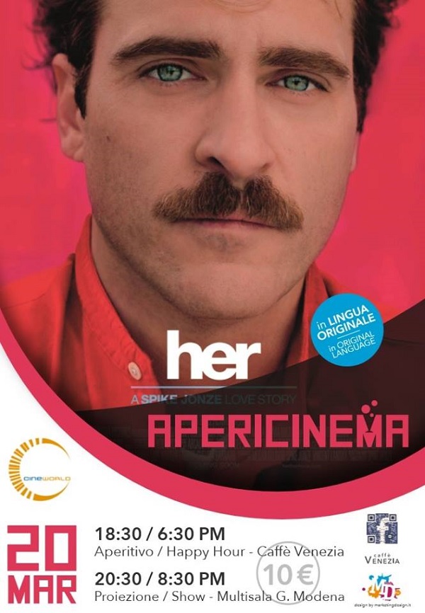 Ritorna, giA� rinnovandosi nella sua formula, il tanto apprezzato Apericinema: l’evento che, con soli 10 a��, permette di fare aperitivo con cibo e stuzzichini e godersi lo spettacolo del grande cinema. GiovedA� 20 marzo 2014, in occasione dell’evento, verrA� proiettato il film Lei/Her in lingua originale!