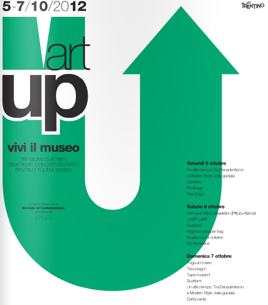 Il Mart aderisce all’8A� Giornata del Contemporaneo con “Mart up! Vivi il museo”, tre giorni di eventi: concerti, spettacoli, laboratori didattici, ingressi gratuiti alle mostre, incontri pubblici e workshop con gli artisti. Entrata libera.