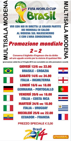 Avete mai guardato una partita di calcio al cinema? In occasione dei mondiali di calcio 2014 A? possibile! Al Multisala G. Modena potrete vedere alcune delle partite piA? emozionanti di questi mondiali in alta definizione, con un audio PCM 5.1A�e in un ambiente confortevole e fresco.