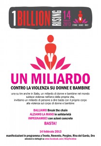 Lo slogan A? “One Billion Rising: un miliardo contro la violenza sulle donne e sulle bambine”. L’appuntamento, One billion rising, A? per il 14 febbraio 2013 in tutto il mondo, Trentino compreso. Per richiedere la fine della violenza contro le donne.