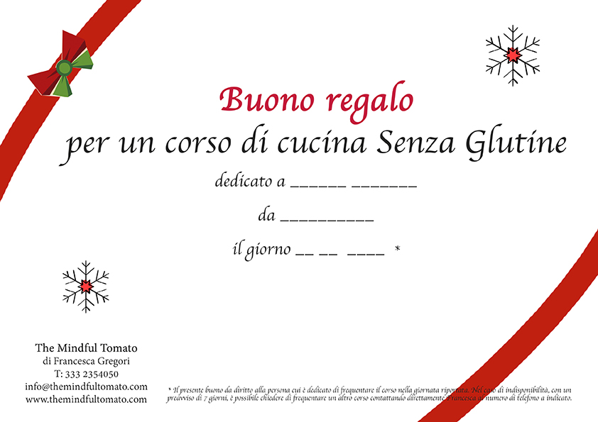 Se l’idea ti piace, ti preparerò una cartolina intestata da inviare al destinatario (in formato elettronico o cartaceo) che lei o lui potrà utilizzare per partecipare ad uno o più corsi di cucina veg senza glutine. Potrai indicare tu stesso l’argomento.