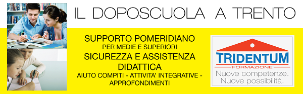 Da queste riflessioni, oltre che da richieste dirette in tal senso, A? nato cosA� il doposcuola Tridentum, che permette alle famiglie di affidarci i loro figli per almeno alcuni pomeriggi in settimana, se non tutti. La tranquillitA� che i ragazzi saranno seguiti da insegnanti competenti nelle varie discipline e aiutati nel “fare i compiti”, si associa cosA� ad attivitA� integrative e stimolanti, come i film in lingua originale, ed alla sicurezza in merito al loro essere in un ambiente controllato e tranquillo. Quest’ultimo punto, evidentemente, A? tanto piA? importante quando si tratta di ragazzi e ragazze molto giovani, come nel caso delle scuole medie o addirittura elementari.