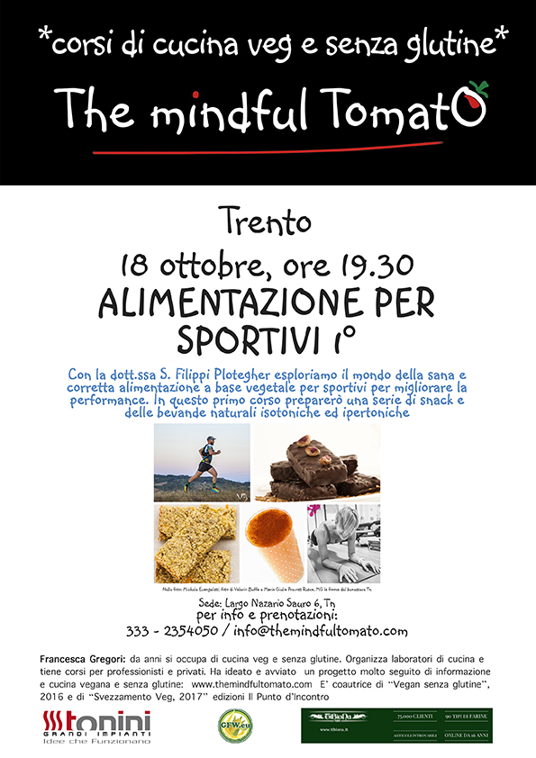 Con la Dott.ssa S. Filippi Plotegher ci addentreremo nei meandri dell’alimentazione per lo sportA�(accennando anche alle differenze tra le varie discipline)A�ed io preparerA? degli snack dolci e salati e delle bevande molto gustosi, energetici e semplici da preparare. Le ricette a base vegetale e senza glutine sono nuove 🙂