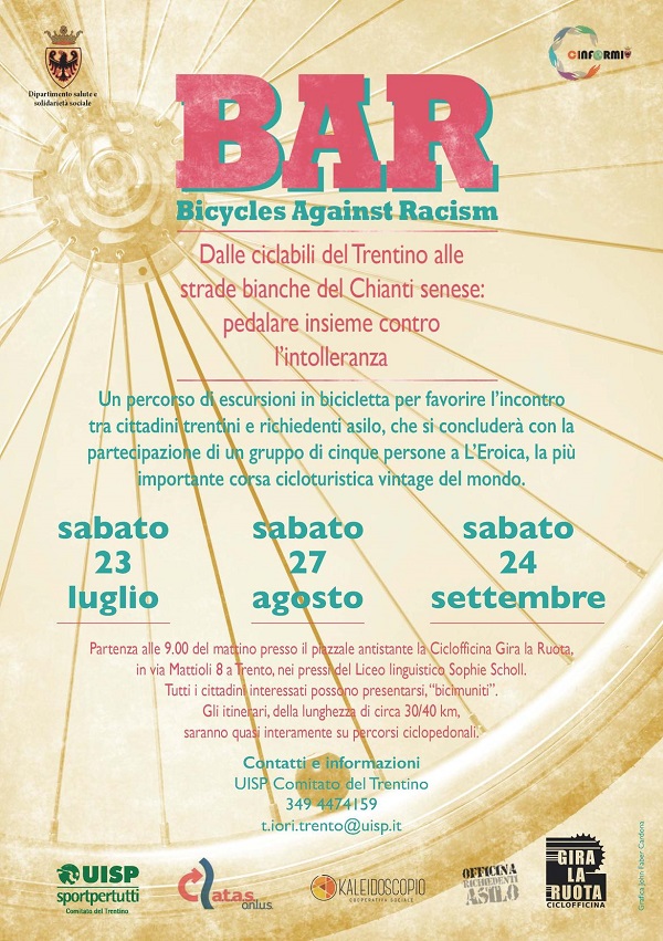 Il progetto valorizza la bicicletta non solo come un mezzo di trasporto, ma come il paradigma di un futuro desiderabile, del quale benessere, sostenibilitA� ambientale, libertA� di movimento possono essere i principali fattori.A�A? stato il Comitato del Trentino della��UISP a procurare cinque iscrizioni per la prestigiosa manifestazione cicloturistica a�?La��Eroicaa�? (www.eroica.it) di Gaiole in Chianti, uno dei piA? importanti eventi internazionali di ciclismo vintage, con cinquemila partecipanti da ogni angolo del mondo. Tre di queste saranno destinate a profughi o richiedenti asilo in provincia di Trento, che verranno coinvolti in un percorso di allenamento e avvicinamento graduale alla manifestazione.