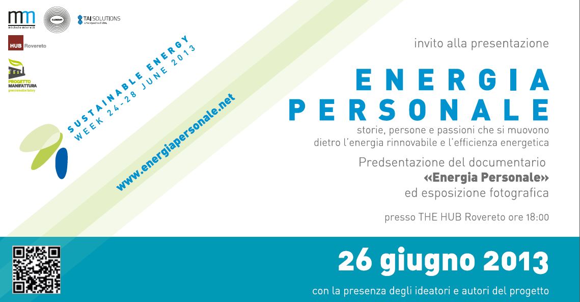 Energia personale verrA� presentato a The Hub Rovereto il 26 giugno e sarA� contestualmente promosso tramite social media. Ad Hub, inoltre, saranno esposti per tutta la Settimana della��Energia i ritratti fotografici dei protagonisti che hanno aderito al progetto decidendo di raccontare la propria storia e il proprio impegno a favore della sostenibilitA� energetica.