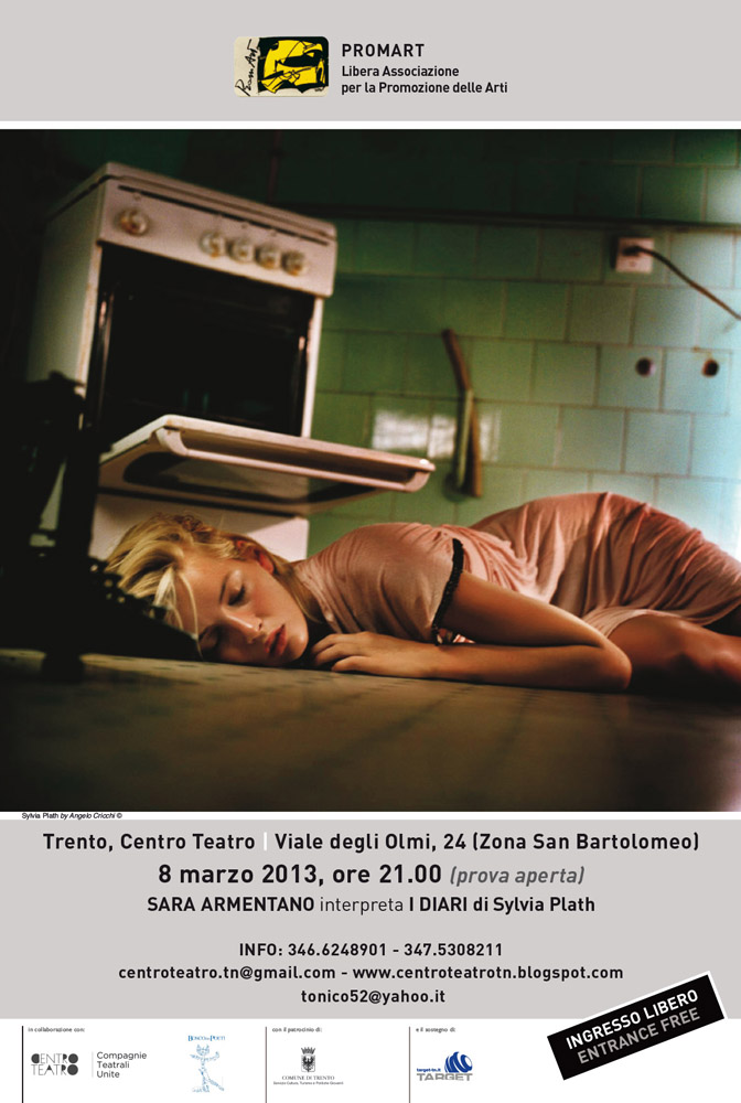 Sylvia Plath scrisse fin da giovanissima dei diari, la��opera piA? importante ed esclusiva di tutta la sua vita. Proprio i diari della poetessa costituiscono la��ossatura del monologo che la��attrice Sara Armentano presenterA�, in forma di prova aperta, venerdA� 8 marzo 2013 alle 21, al Centro Teatro del Comune di Trento. a�?Sylvia Plath: i diaria�? viene proposto dalla��associazione culturale Promart in occasione della giornata della donna.