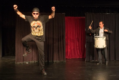 Brillante intuizione di un comico che da 25 anni percorre i teatri della Germania , Valter Rado, degno erede degli antichi Comici dell’Arte, che sapevano portare il mestiere del divertimento in giro per l’Europa con una formula export che sa arrivare dritto in pancia agli spettatori. Suo degno compagno la��affermato e funambolico musicista Massimo Tuzza, batterista virtuoso e percussionista esplosivo, che ritorna sul palcoscenico teatrale dopo 25 anni a riscoprire il clown che A? in lui.