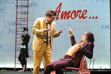Domina la scena, priva di ogni citazione settecentesca (cosA� come i costumi) una lavagna che, riempendosi di a�?graffitia�?, fa da sfondo al crescendo incalzante degli incontri fra i numerosi protagonisti della vicenda. Fra questi una figura del tutto originale nell’economia della piA?ce, un personaggio in frac che rappresenta Amore, il vero motore di questa commedia corale, vorticosa, divertente e vivace.