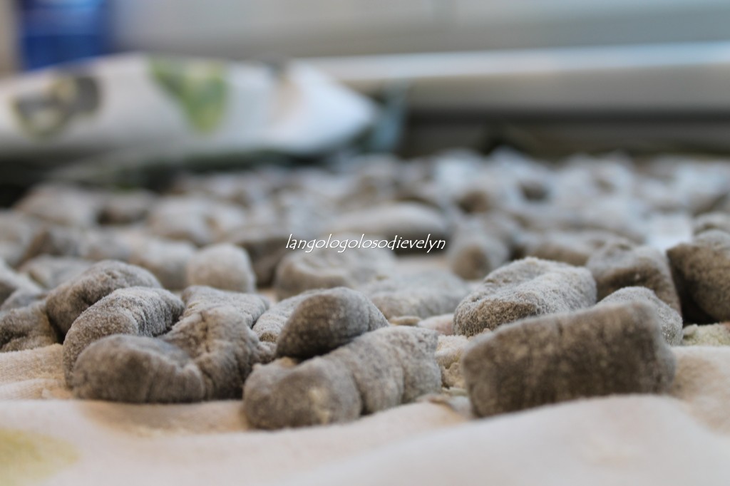 Una volta che le patate saranno cotte prendiamo lo schiaccia patate e quando ancora le patate saranno calde le posizioniamo alla��interno dello schiaccia patate e schiacciamo. Cosi facendo non ci ustioniamo le mani ed in un colpo solo peliamo e sminuzziamo le nostre patate (bello no?!). Una volta ottenuta la nostra purea, la facciamo raffreddare e la adagiamo in una ciotola capiente. Una volta fredda aggiungiamo alle patate il sale, il nero di seppia e la farina. Iniziamo ad impastare, inizierA� a formarsi una palla, a questo punto ci spostiamo sul nostro piano di lavoro ed impastiamo fino a quando non otteniamo una palla non appiccicosa (eventualmente aggiungere una spolverata di farina) e nera in modo uniforme.